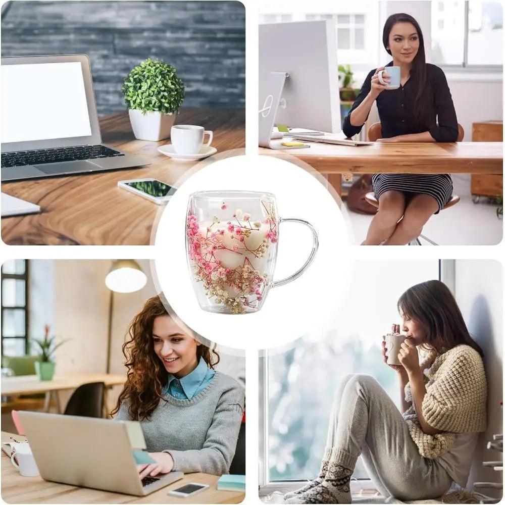 Elevate your coffee experience with the Flower Glass Espresso Cup, expertly crafted from high-quality glass featuring a unique double-wall design. This innovative construction not only enhances insulation, keeping your espresso hot while the outer surface remains cool to the touch, but also showcases delicate dried flowers embedded within the glass for an elegant aesthetic. Ideal for home use, this cup combines functionality with artistic appeal, making each sip a refined moment. The package includes one beautifully designed dried flowers glass mug, perfect for those who appreciate both style and performance in their coffeeware.