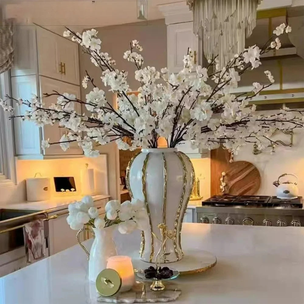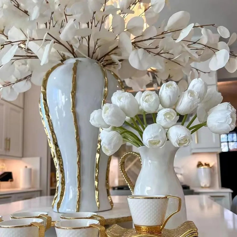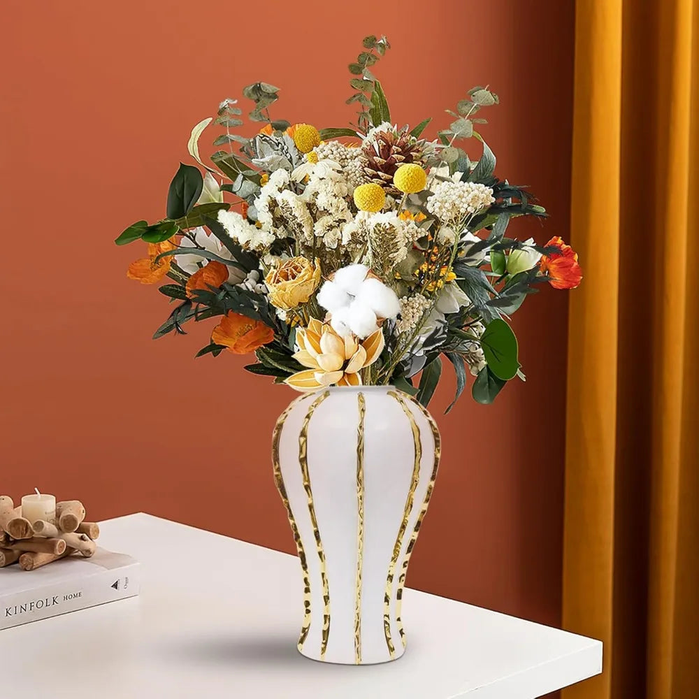 Elevate your interior decor with this expertly crafted 14-inch ceramic vase, featuring a sophisticated white and gold finish. Made from high-quality ceramic and porcelain, this vase is free from harmful chemicals, ensuring safety and durability. Its modern jar shape, measuring 7.08 inches in length and width and standing 14.1 inches tall, makes it a versatile centerpiece for any room. Proudly originating from the US, this vase combines timeless elegance with contemporary style, perfect for showcasing flowers or as a standalone decorative piece that enhances your living space with refined charm.